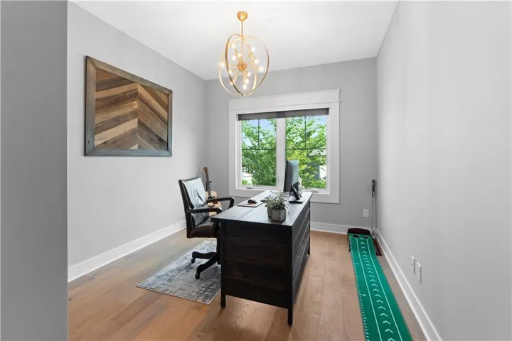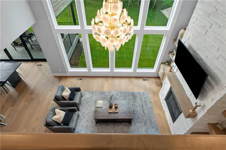 oak hardwood floors flowing seamlessly across the open main level illuminated by a stunning chandelier and floor to\r\n