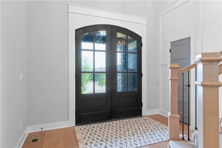 front porch through mahogany double doors. Inside you are greeted by a stunning curved floating staircase and 6” white\r\n