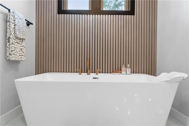 bathroom is spa-inspired with Calcatta Macchia Vecchia Quartz double vanities, statement pendant lights, and\r\n