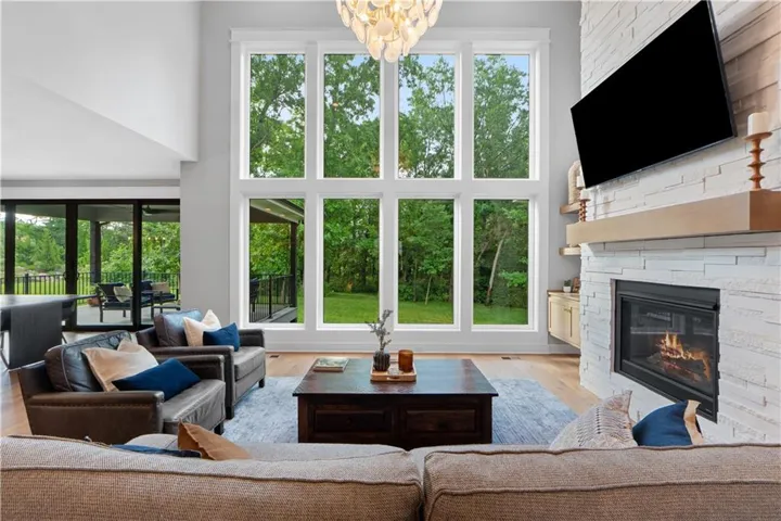 ceiling stacked stone fireplace. The chef’s kitchen is a centerpiece: 10' waterfall island in Calcatta white & black quartz,\r\n