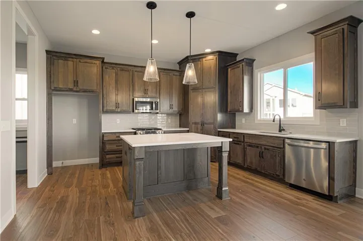 The beautifully designed kitchen showcases STAINED CABINETS, custom craftsmanship, spacious island, upgraded appliances, quartz & granite countertops, and a generous walk-in corner pantry.\r\n