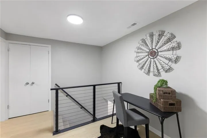 "LongDescription" => "Home office featuring dark carpet and a ceiling fan"
