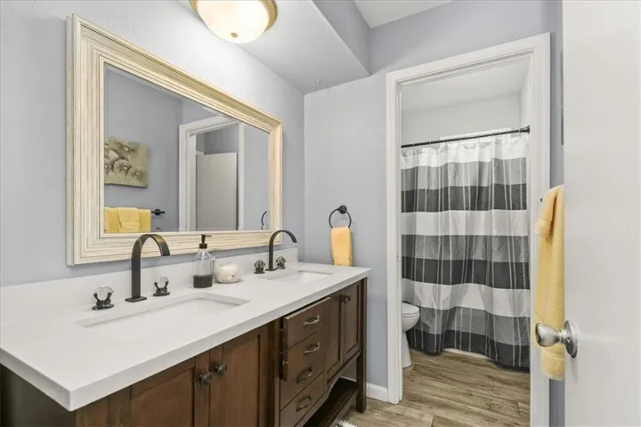 Speaking of entertaining, you can step right through the sliding glass doors onto your expansive, private outdoor deck! This is the ultimate hub for relaxation, overlooking a large, fully fenced backyard, complete with a fantastic bonus: a detached utility garage/workshop. Inside, you’ll love the renovated interiors, which boast contemporary paint colors, updated flooring, and a master bathroom featuring a designer double vanity with rich wood-tone cabinetry and modern black fixtures. Even the living room stands out, with custom built-ins flanking the entertainment center, adding high-end functional appeal.\r\n