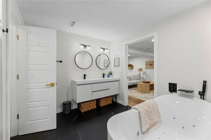 The custom finished basement is a true standout—not the standard finish you see in similar models. It includes a third bedroom that lives like a second primary suite, complete with a freestanding jetted tub, a spacious rec room, a wet bar, and ample storage space.\r\n