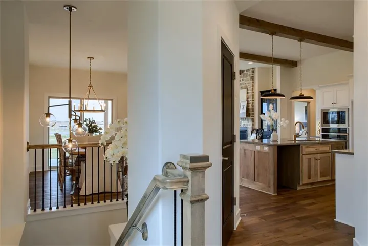 "LongDescription" => "Hall with an upstairs landing, dark wood-style flooring, a tray ceiling, and recessed lighting"