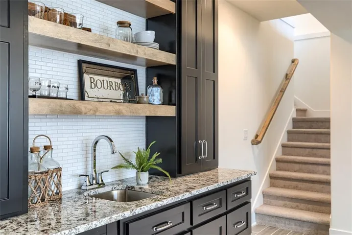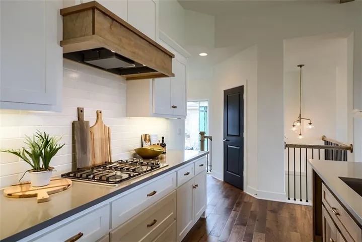 "LongDescription" => "Kitchen with backsplash, white cabinets, decorative light fixtures, stainless steel microwave, and dark wood-style floors"
