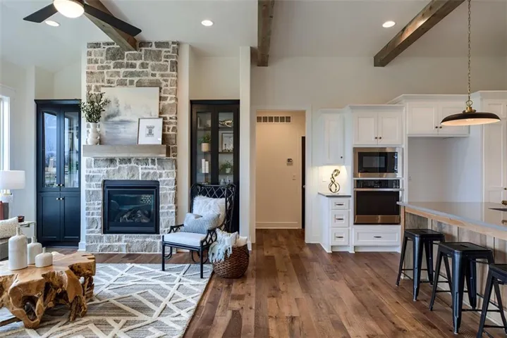 "LongDescription" => "Unfurnished living room with dark wood finished floors, a fireplace, ceiling fan, recessed lighting, and a tray ceiling"