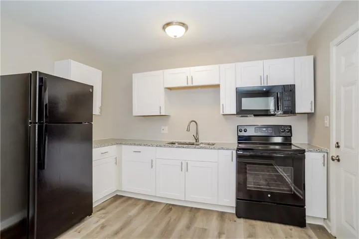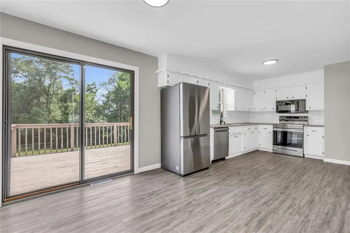 "LongDescription" => "Kitchen featuring stainless steel appliances, white cabinetry, light wood-style floors, and light stone counters"