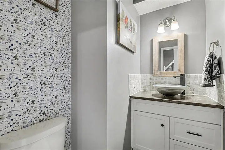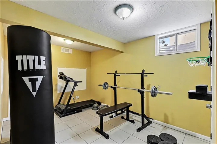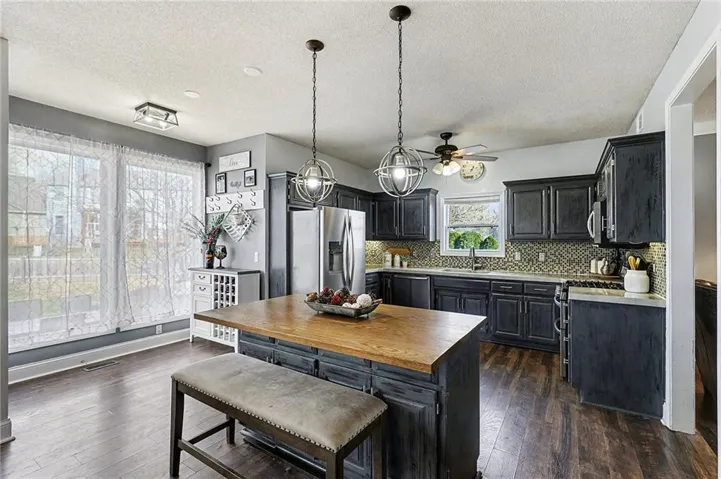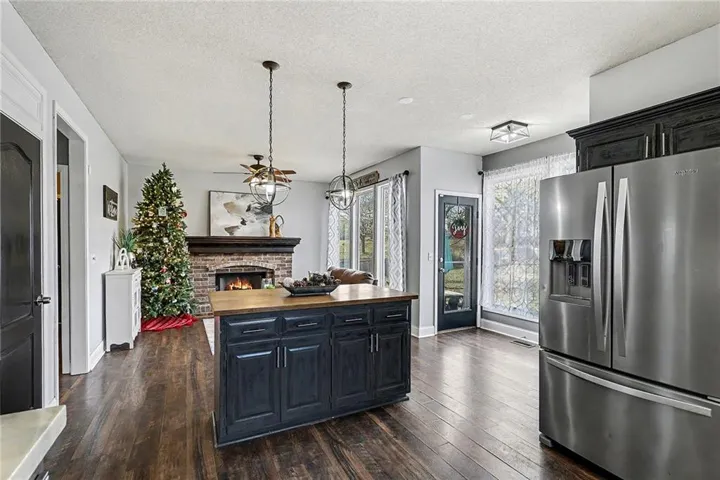 dishwasher, and refrigerator that stays with the home. The adjoining hearth room with gas log fireplace offers great flow for everyday living and entertaining. Upstairs, the primary suite boasts a spacious walk-in closet and refreshed bath. Three additional bedrooms share a generous hall bathroom with double sinks and separate stool/tub room. The finished lower level adds even more versatility with a family room, flex space/exercise room with tile flooring, and abundant storage. Step outside to the oversized, wood fenced backyard and patio—ideal for play, pets, and outdoor gatherings. The underground sprinkling system will keep your grass green all summer long and the new air conditioner will be appreciated when the July heat arrives. Enjoy fantastic neighborhood amenities including a pool, play area, and paved trails all located in the top-rated Olathe School District and minutes from shops, restaurants, and convenient highway access. This one checks all the boxes—don’t miss it!