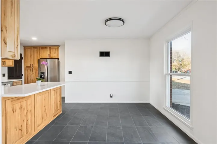 "LongDescription" => "Kitchen with freestanding refrigerator, white cabinets, wood counters, light wood-type flooring, and estacked washer and dryer"
