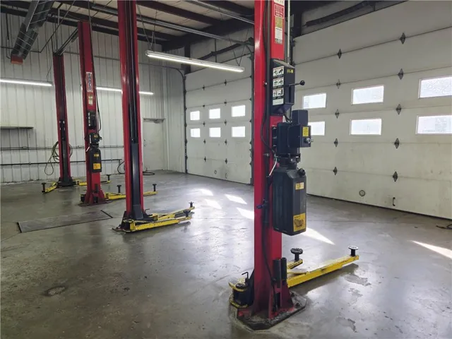 The shop features three 9,000-pound, two-post above-ground lifts, along with four overhead doors (two 10x10 and two 10x12) to accommodate multiple vehicle sizes. The interior includes dedicated office space with a public restroom, plus a private employee area with lockers, shower, and restroom, as well as a convenient breakroom. A storage loft above the office provides additional space for parts or equipment.\r\n