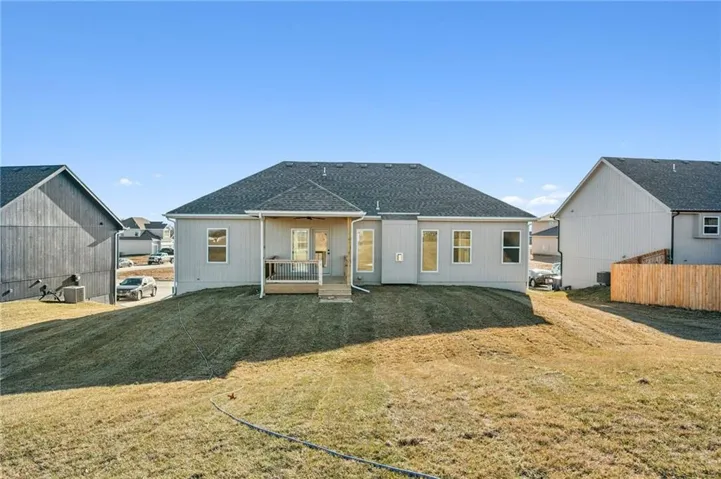 "LongDescription" => "Ranch-style home with a shingled roof, board and batten siding, concrete driveway, a front lawn, and an attached garage"
