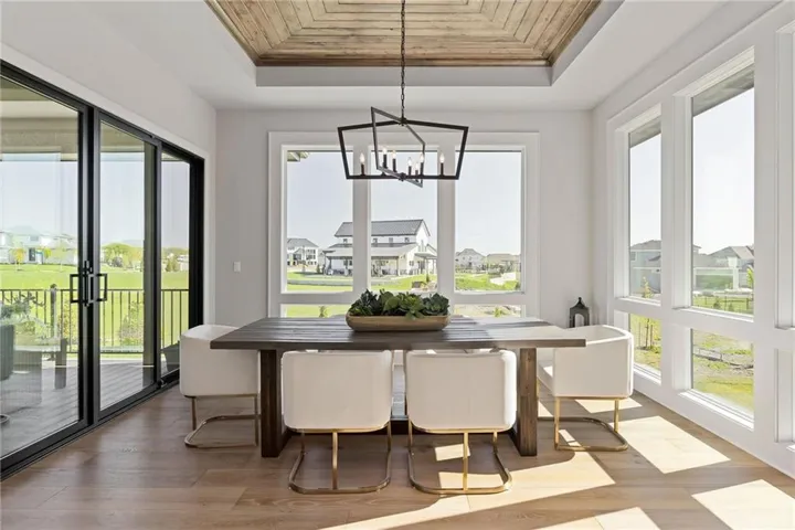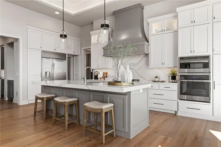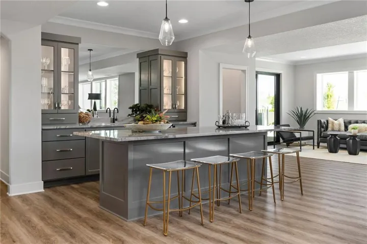 The highly sought-after Mustang plan by Willis Custom Homes is now underway at REGENTS PARK in Leawood on premier walkout Lot 1, with estimated completion in Late Fall 2026. You can still make selections and customize this home! This reverse 1.5-story home blends timeless architecture with a livable layout designed for both everyday comfort and entertaining. Upon entry, a striking two-story feature wall along the staircase creates a strong architectural moment while maintaining a clean, spacious entry. The main level is anchored by a great room featuring three box-vaulted ceiling details with custom trim and cove lighting, adding depth and volume to the heart of the home.\r\n