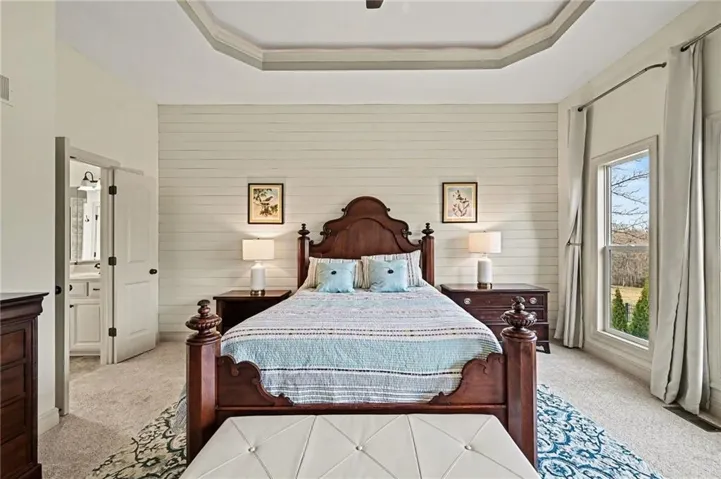 The main-level primary suite is a retreat of its own with vaulted ceilings, a shiplap accent wall, and beautiful views of the green space. The ensuite bath offers dual vanities, a corner jacuzzi tub, a spacious walk-in shower, and direct access to the walk-in closet. A secondary main-level bedroom works perfectly as a guest room or home office and is conveniently located near a full bathroom.\r\n