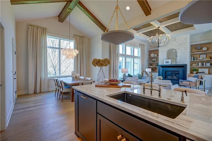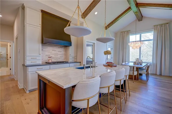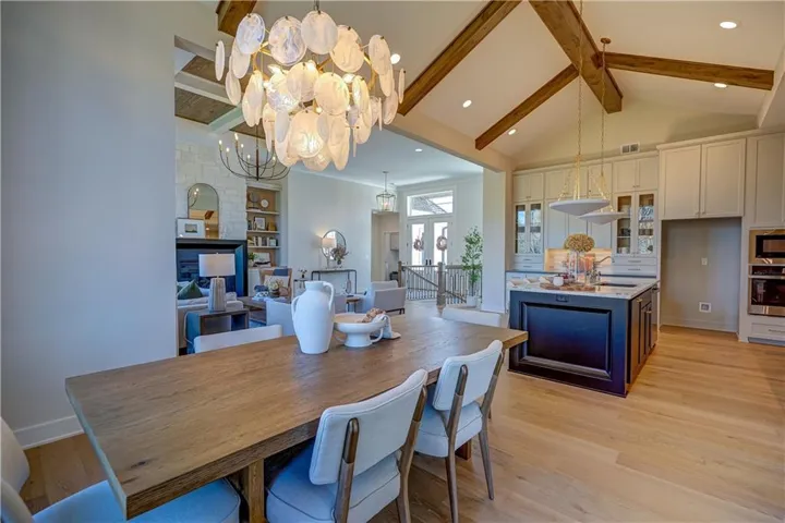 The main level features 2,108 SF with an open concept living area highlighted by cathedral ceilings, beautiful hardwood flooring, striking beams, and light, neutral finishes throughout. The gourmet kitchen offers abundant cabinetry, a prep kitchen with a second oven and microwave, mini fridge, and seamless flow into the living room, perfect for everyday living and entertaining. Step outside to the patio just off the kitchen, complete with a cozy fireplace and built-in storage for cushions or outdoor essentials.\r\n