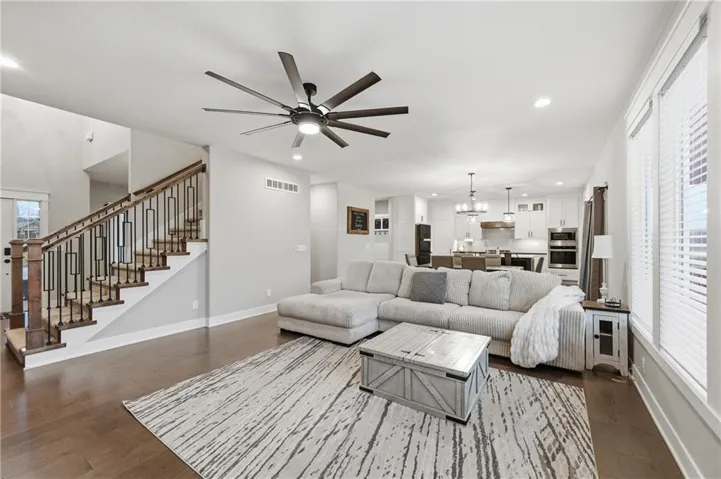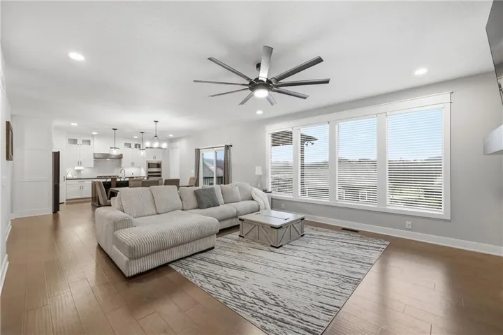 "LongDescription" => "Living room featuring light wood-type flooring, recessed lighting, ceiling fan, and beamed ceiling"