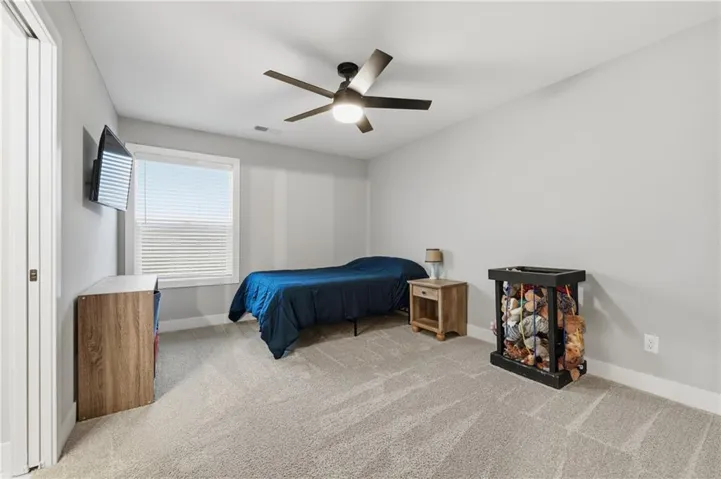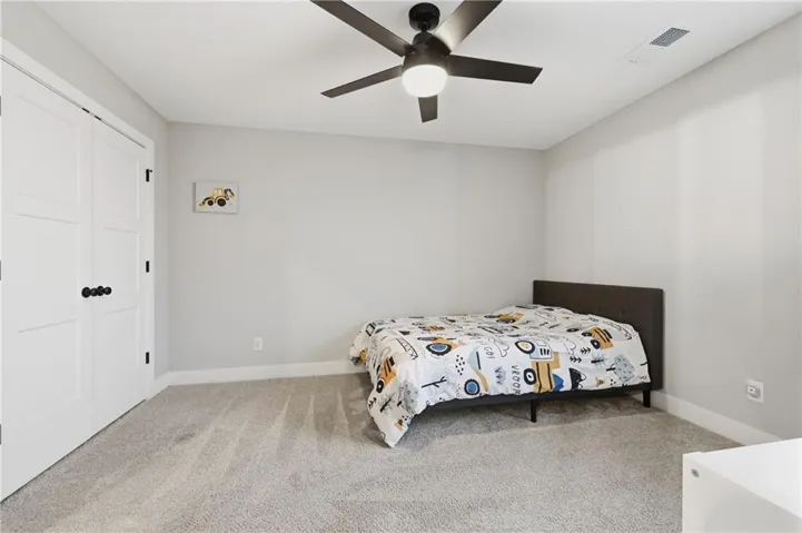 "LongDescription" => "Bedroom with light colored carpet, a ceiling fan, a raised ceiling, and recessed lighting"