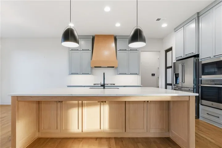 The kitchen—designed for entertaining and everyday living, showcases an oversized island with storage and seating, custom cabinetry to ceiling, quartz, and walk-in pantry. All SS appliances stay, including a newer KitchenAid dishwasher and high-end KitchenAid refrigerator!\r\n