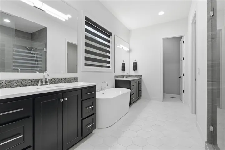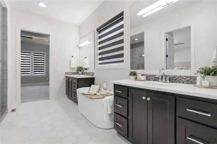 Thoughtfully designed for main-level living, the primary suite is a private retreat featuring separate vanities, luxurious soaking tub, walk-in shower with bench, and a spacious walk-in closet with direct access to the laundry room . A stylish powder room for guests and a dedicated office with double doors add both function and flexibility upstairs.\r\n