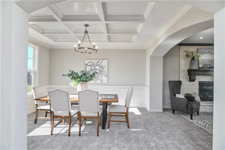 A versatile main-level flex room with closet and wood-paneled ceiling provides ideal space for a home office or fifth bedroom. The mud room includes a boot bench and entry closet, while the great room is anchored by a stone direct-vent fireplace with wood mantle.\r\n