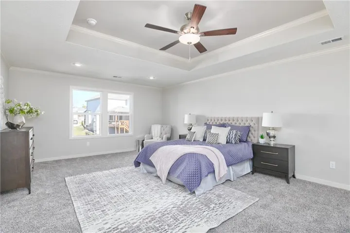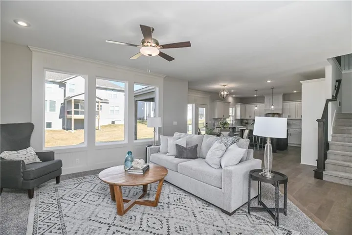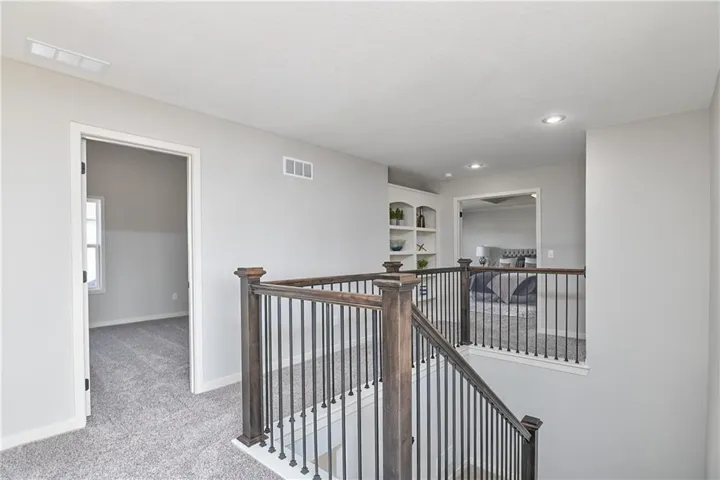 Tile flooring is featured in all bathrooms and the laundry room, with Berber carpet on the stairs. Enjoy outdoor living on the covered patio with a full sprinkler system. Located in Prairie Farms, residents enjoy neighborhood amenities including walking trails, pool, playground, and convenient walking distance to Lake Olathe.