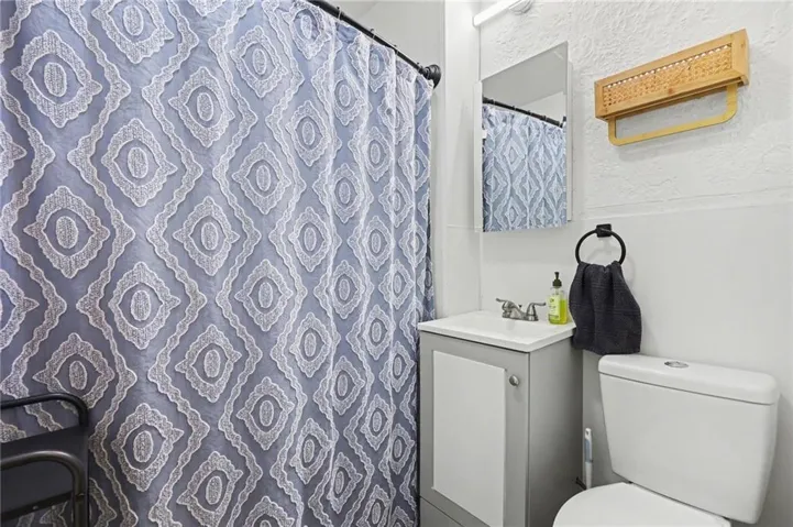"LongDescription" => "Full bathroom featuring a shower with shower curtain, vanity, and a textured ceiling"