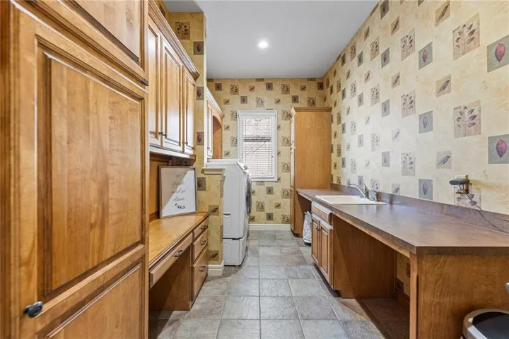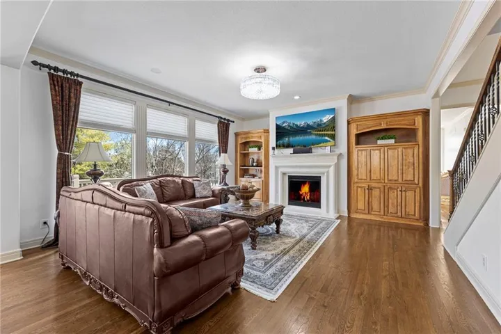 +"PublicRemarks": "Exceptional luxury living in sought-after Whitehorse! This stunning 2-story home offers over 5,800 sqft of living space on a private 16,000 sqft lot backing to the neighborhood park, providing rare privacy and serene views. Built by Koehler Building Company, family-owned since 1957, this home reflects timeless craftsmanship and is located in the highly acclaimed Blue Valley School District, ranked in the top 1% nationally. A grand entry welcomes you with hardwood floors throughout the main level, a formal dining room with plantation shutters, and a private main-level office with built-in cabinetry. The formal living room features a gas fireplace and floor-to-ceiling windows overlooking the backyard, while the spacious great room offers a custom fireplace flanked by built-ins. The gourmet kitchen includes custom cabinetry, Viking stainless steel appliances, double ovens, granite countertops, and a walk-in pantry. The oversized laundry room offers a wash sink, built-in storage, and a desk. Upstairs, four spacious bedrooms each feature private en-suite baths and walk-in closets. The luxurious primary suite boasts vaulted ceilings, a sitting room with a fireplace, and backyard views, plus a spa-style bath with a soaking tub, walk-in shower, double vanities, makeup vanity, and a huge custom walk-in closet with a center island. The finished daylight basement includes a recreation room (pool table stays), bedroom or office, full bath, exercise room, and ample storage. Enjoy outdoor living with a level fenced backyard, composite deck, patio, irrigation system, and gorgeous landscaping. Neighborhood amenities include a clubhouse, swimming pool, and tennis courts."