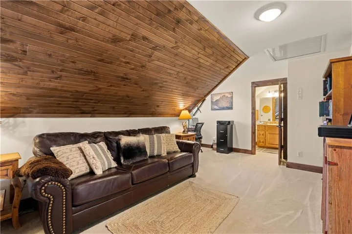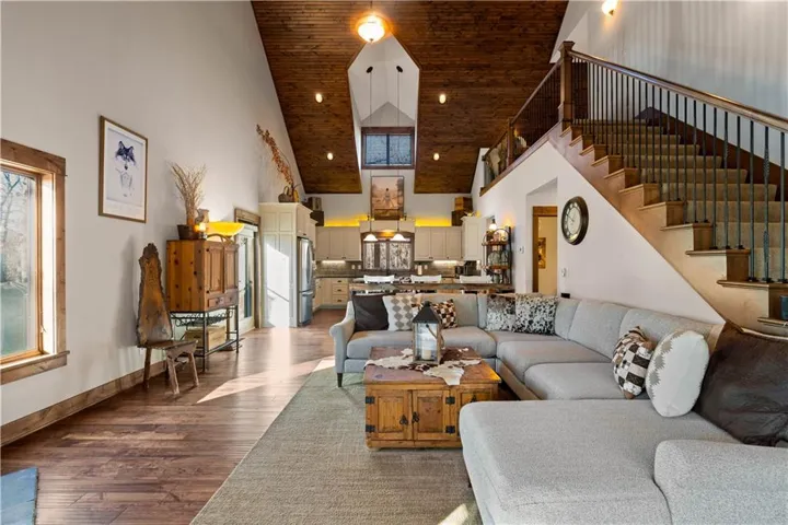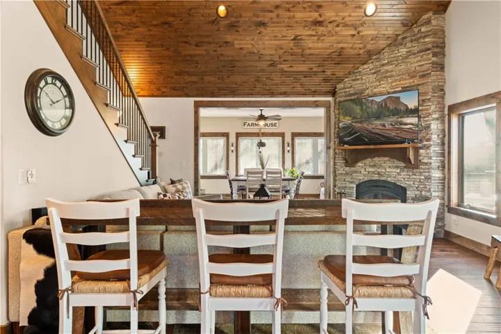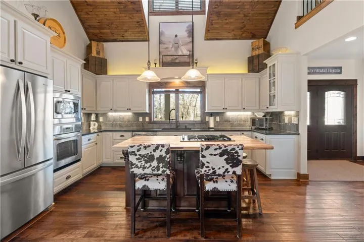 Inside, the open-concept layout showcases vaulted wood ceilings and a striking floor-to-ceiling stone, wood-burning fireplace, creating a warm and inviting great room that anchors the home. Custom cabinetry, walnut-stained alder ceilings, birch hardwood flooring, alder trim, and custom doors highlight the craftsmanship throughout. The kitchen is appointed with granite countertops, stainless steel appliances, a gas cooktop, walk-in pantry, and ample storage. Outdoor living is enhanced by an 18x16 deck with illuminated railing, grill bump-out, and extended walkway—perfect for entertaining or enjoying the serene surroundings.\r\n
