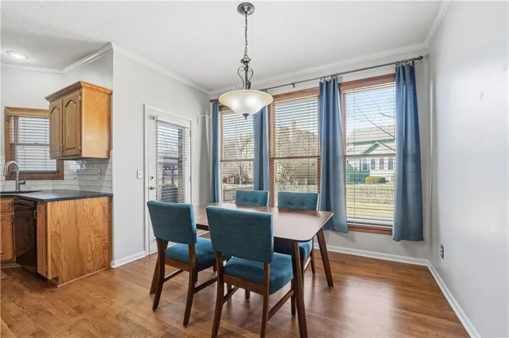 "LongDescription" => "Kitchen featuring two tone color scheme, decorative light fixtures, tasteful backsplash, light wood-style flooring, and a kitchen island with sink"