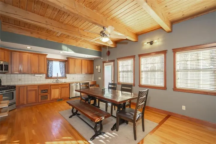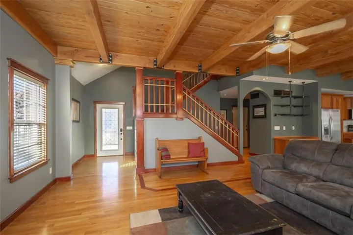 This unique 2-story home is tucked into a quiet cul-de-sac and offers a setting that feels reminiscent of Colorado. Solid cedar siding, tall ceilings with striking wood beams, and an abundance of windows on both levels fill the home with natural light and frame views of the treed backyard with natural boulders. The open floor plan connects the kitchen, dining, and living areas, highlighting beautiful wood floors, custom cabinetry, rich trim work, and craftsmanship throughout. Take in the dramatic beams in the living room, the beautiful staircase, and the many custom details that give this home its character.\r\n