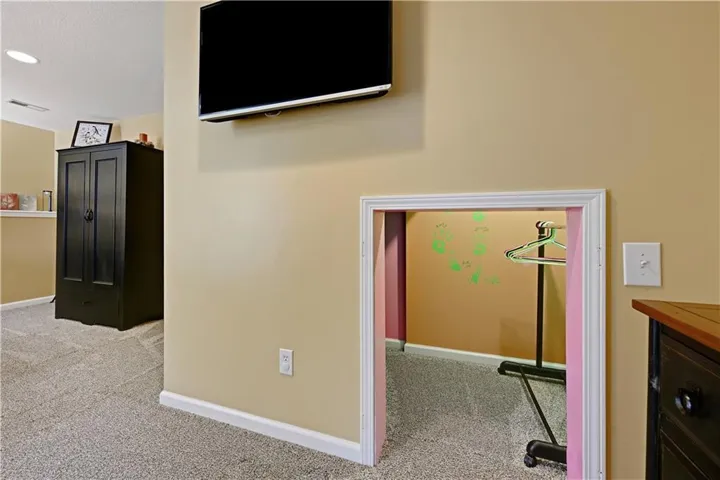 The main level features a fully remodeled kitchen with custom cabinetry thoughtfully designed with pull-out drawers for easy access. The kitchen opens seamlessly to the family room, creating a spacious and inviting gathering space. A formal dining room is perfect for family gatherings and special occasions, while the formal living room adds flexibility for entertaining. Also on the main level is a dedicated home office that anyone working from home will love, complete with a wall of built-in cabinets and shelving. Upstairs you’ll find the primary suite along with three additional bedrooms. The primary suite includes a generous closet plus a bonus room that works perfectly as a second office, dressing room, or additional closet space—you truly have to see it to believe it. The finished walkout lower level offers a third living area with a walk-up bar, ideal for movie nights, popcorn, and snacks, and provides easy access to the private outdoor setting. A super-sized non-conforming fifth bedroom adds incredible flexibility for guests, a gym, hobby room, or additional living space. This home has seen many updates, including newer carpet approximately 1.5 years old, HVAC, a kitchen remodel, windows, and roof, surround sound in the great room, WIFI garage door opener (My Q ) and a programmable thermostat. \r\n