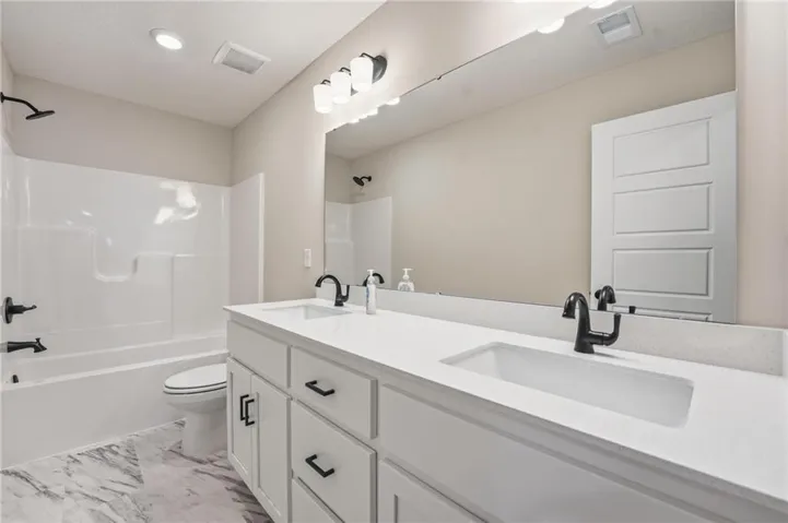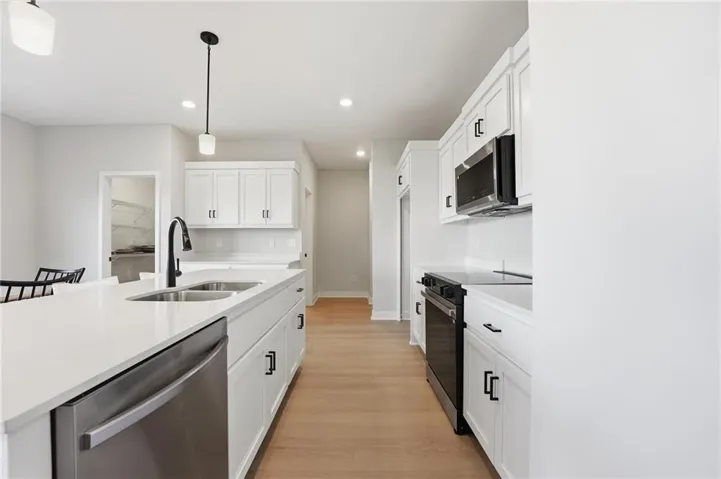 Our Basswood home plan with our Design Series 3, Package D features a modern, open layout designed for comfortable living. The main level highlights a spacious kitchen with a large island that overlooks both the dining and great rooms, making it perfect for entertainment and family gatherings. Additionally, a sizable home office on this level provides a dedicated space for work or study. Upstairs, the primary bedroom is a luxurious retreat with a spa-like bathroom, complete with an oversized countertop, dual sinks, and a walk-in shower. The second floor also includes a large full bath for shared use and a conveniently located laundry room adjacent to the 3 bedrooms. \r\n