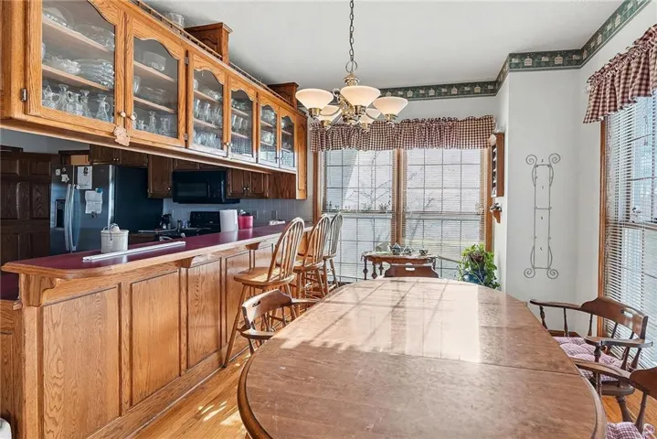 A grand double-door entry opens to a stunning two-story foyer with a curved staircase leading to the upper level. The formal dining room off the entry is generously sized, perfect for hosting large gatherings. The kitchen offers abundant cabinet space, a walk-in pantry conveniently located near the laundry room, an eat-in breakfast nook with peaceful backyard views, and a wood-burning fireplace.\r\n
