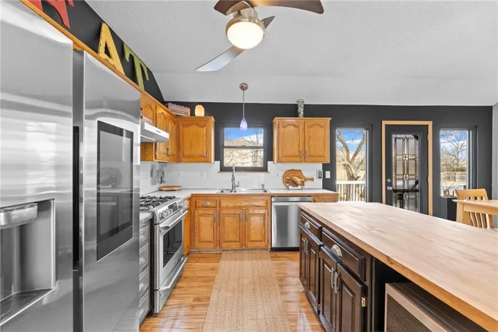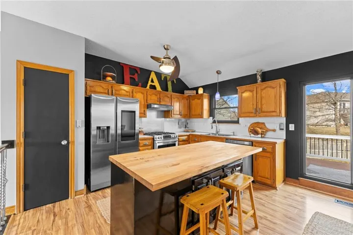 +"PublicRemarks": "Well kept one owner split level in a prime Olathe location close to schools, shopping, dining, and easy highway access. The living room features a cozy fireplace and the home offers a functional layout with a finished basement including a family room and 4th bedroom. The basement half bath is stubbed for a shower, offering easy potential to add a full bathroom. Enjoy a fenced backyard, central vacuum system, and pride of ownership throughout. One year home warranty provided for peace of mind. Located in the Olathe School District serving Olathe North High School, Santa Fe Trail Middle School, and Woodland Elementary. Homes in this area are hard to find."