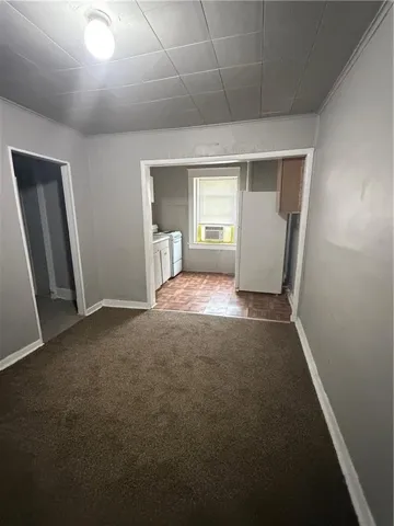 "LongDescription" => "Kitchen with white appliances, wood finish cabinetry, stacked washer and dryer, and dark wood finished floors"
