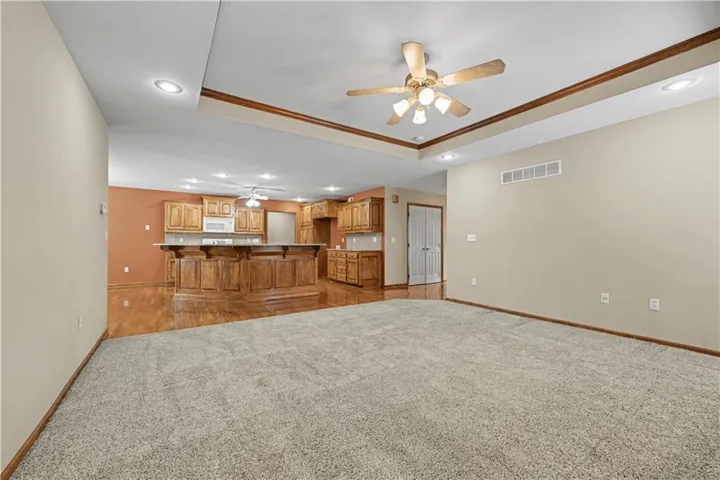 "LongDescription" => "Empty room with light carpet, ceiling fan, and wood walls"