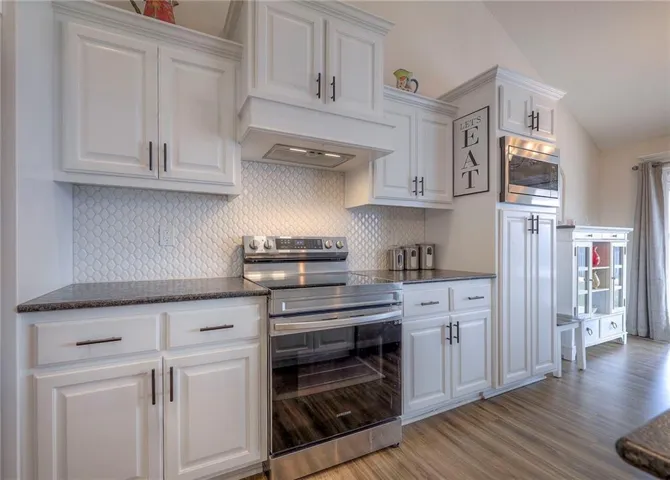 +"PublicRemarks": "Welcome to this beautifully maintained, like-new ranch/reverse 1.5 home. The open-concept living room, kitchen, and breakfast area create an inviting first impression with vaulted cathedral ceilings, luxury vinyl plank flooring, and expansive windows that fill the space with tons of natural light. The kitchen blends style and function, offering ample room for cooking, gathering, and entertaining, with upgraded granite countertops, a beautiful tile backsplash, painted cabinetry, and stainless steel appliances. Just off the kitchen, the breakfast room features sliding glass doors that lead to the covered patio, while the living room features a stunning stone-front gas fireplace. The primary bedroom is light-filled and refined with vaulted ceilings and box bay windows overlooking the backyard. The en suite bathroom offers a double bowl sink, a beautifully tiled custom walk-in shower with a built-in niche & a granite-topped bench, and a walk-in closet. The main level also includes two additional bedrooms with generous closet space, a second full bathroom, and conveniently located laundry. The builder-finished basement expands the living space with a fourth bedroom that has a large egress window, a third full bathroom, and plenty of room to entertain in the large family room and recreation area. Situated on a generous corner lot, the home offers a sizable patio with both covered and uncovered areas, perfect for future BBQ's and fun! Upgrades/Updates: irrigation system, buried downspouts, landscaping, a vertical garage door opener, and an expansion to the patio."