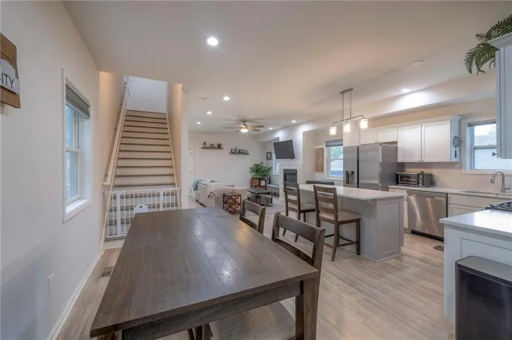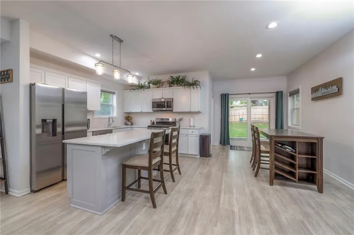 "LongDescription" => "Kitchen with appliances with stainless steel finishes, white cabinetry, tasteful backsplash, a breakfast bar area, and recessed lighting"