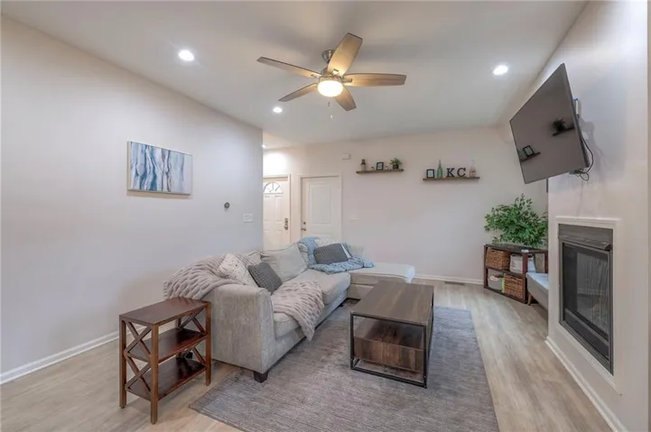 "LongDescription" => "Living room featuring light wood-type flooring, recessed lighting, ceiling fan, and beamed ceiling"