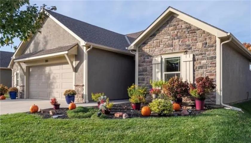 "LongDescription" => "View of front of home featuring stone siding, a front yard, concrete driveway, a garage, and stucco siding"