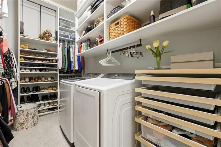 The primary suite is thoughtfully designed with comfort in mind, offering a custom closet system, dual-sink vanity, and a spa-inspired bath with dual shower heads. For added ease, the laundry room is conveniently located within the primary closet.\r\n